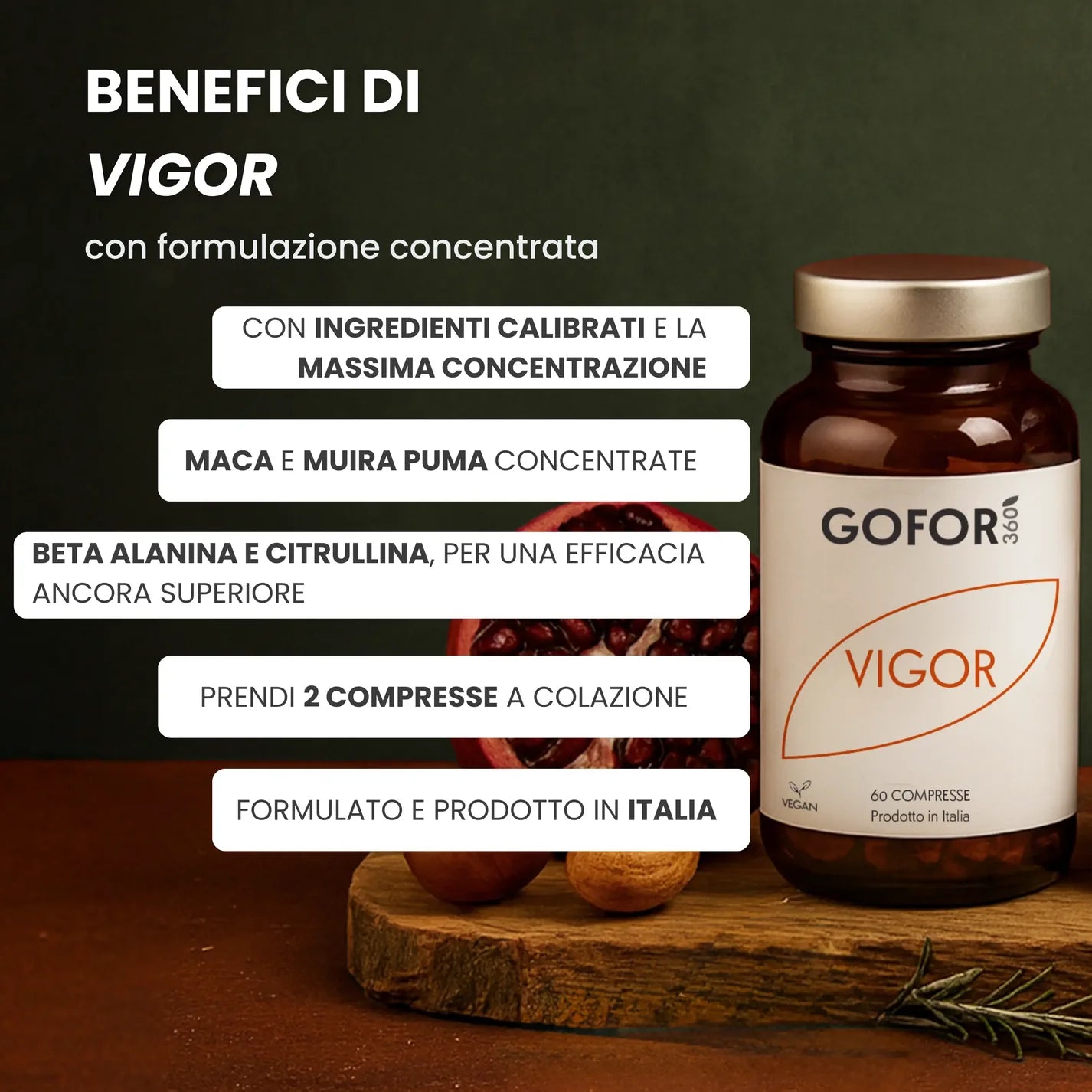 • Metabolismo energetico: Vigor inizia a supportare i normali livelli di energia, aiutando l’organismo ad affrontare giornate intense e attività impegnative.