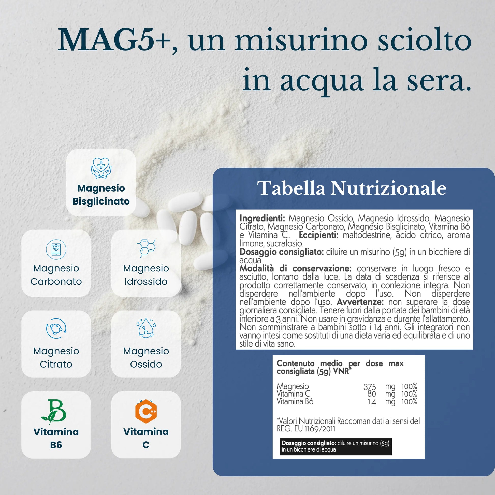 Ingredienti: Magnesio carbonato, Magnesio idrossido, Magnesio citrato, Magnesio ossido, Magnesio Bisglicinato, Vitamina C, Vitamina B6.