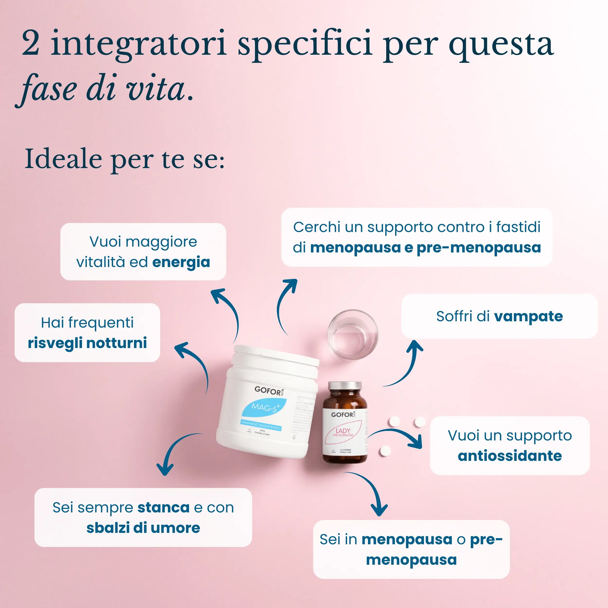Indicazioni: il Trifoglio Rosso è utile per contrastare i disturbi della menopausa, l’Equiseto per sostenere il drenaggio dei liquidi corporei e la Maca come tonico e adattogeno.